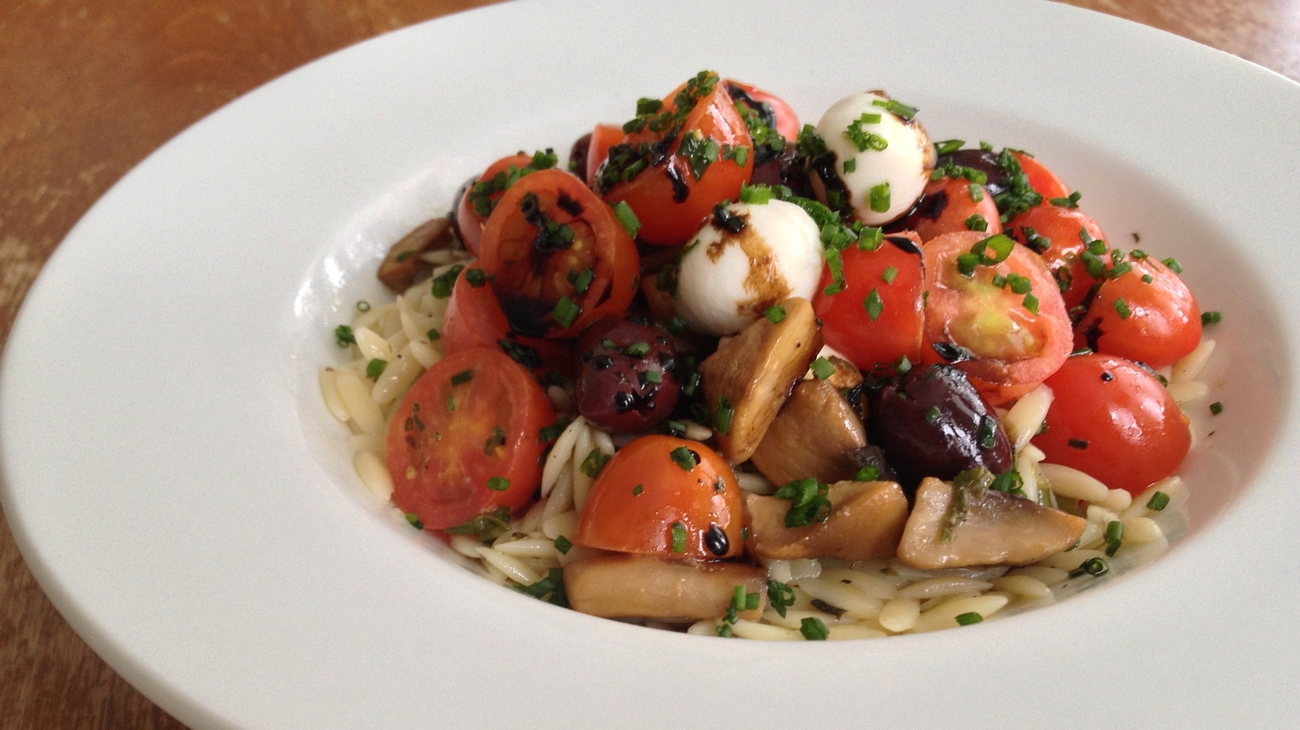 Salade de tomates, olives & bocconcinis servie sur orzo à l’origan