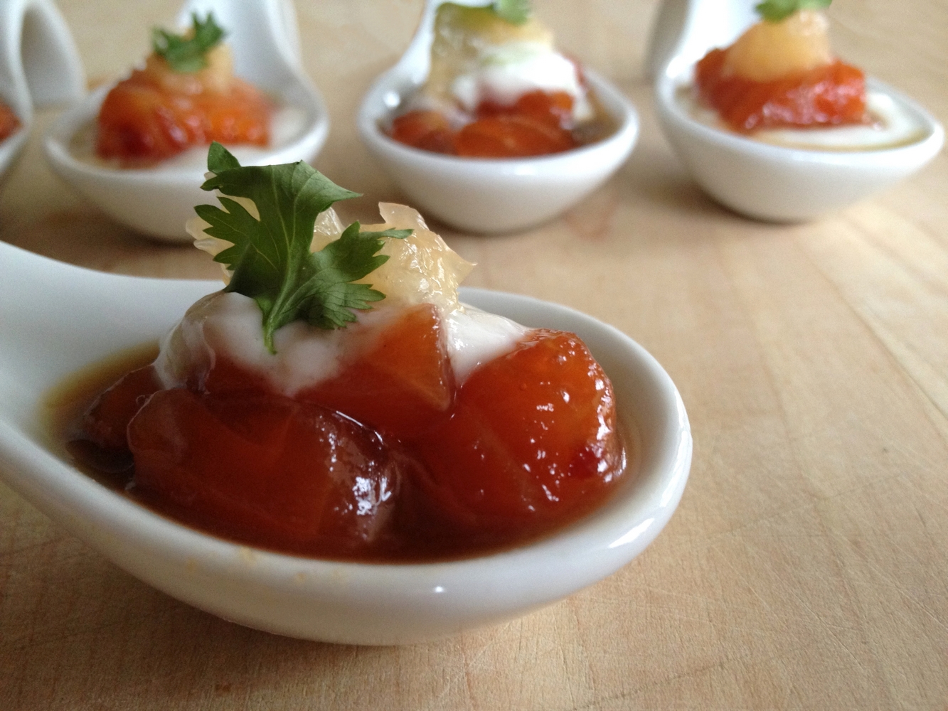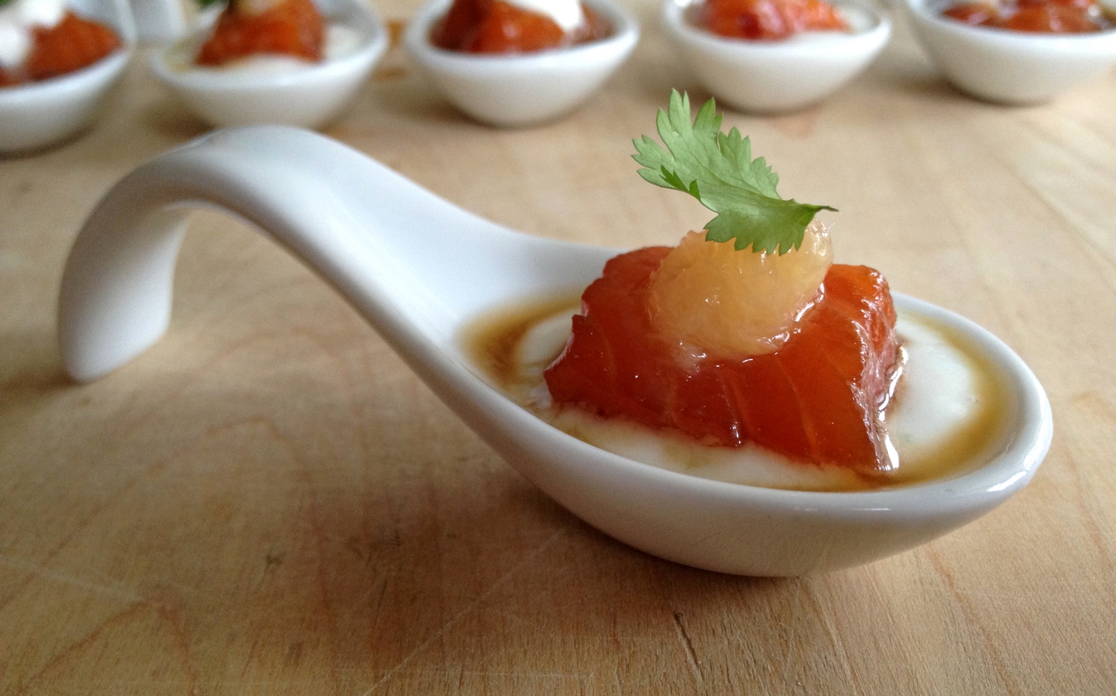 5. Montage pour des petites bouchées individuelles : mettre une c. à thé de yogourt, ajouter un cube de truite marinée, un petit cube de suprême de pamplemousse et une feuille de coriandre.