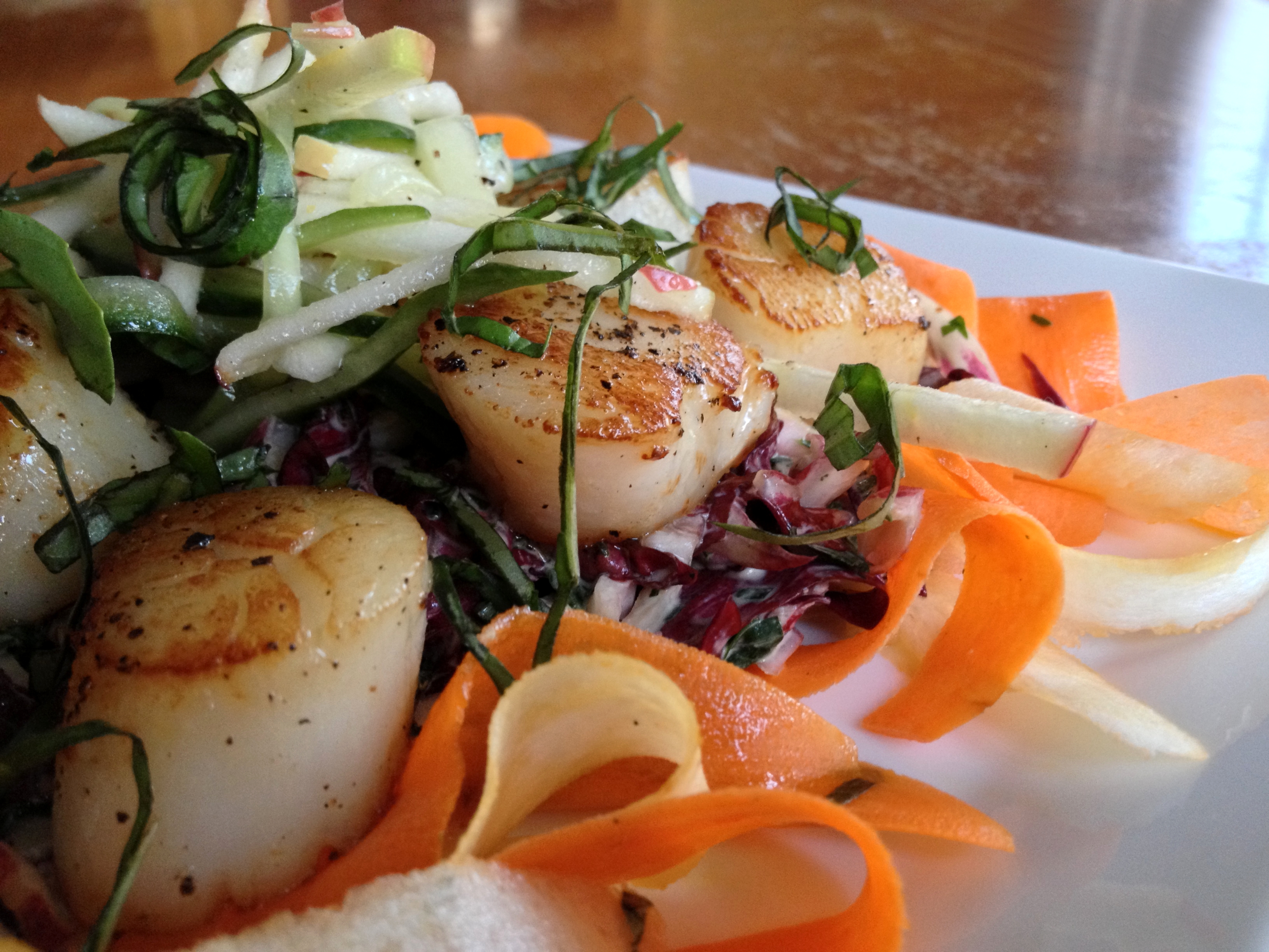 Miam les salades!! Miam les pétoncles!! MIAM!!! C’est si bon, et encore meilleur dégusté à l’extérieur, au soleil, avec un bon p’tit verre de vin. Et devinez quoi?! L’été arrive à grands pas!!! ENFIIIIIIIIIIIIIIIIIIN. (Ça fait déjà quelques semaines que je suis prête et que je m’imagine en train de siroter un cocktail sur le bord d’une piscine en me fesant bronzer. Ouf, la belle vie.) Voici donc une recette rafraichissante et légère (et santé, pour faire changement) qui vous permettra de manger des bons légumes puisqu’elle est composée non pas d’une seule et unique salade, mais bien de trois salades simples et délicieuses! OUI! Hourra!!! (Pardonnez-moi pour l’excès de majuscules et de points d’exclamation, je suis vraiment trop motivée aujourd’hui…!!!!!!)