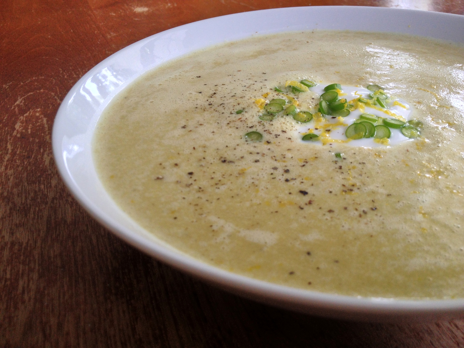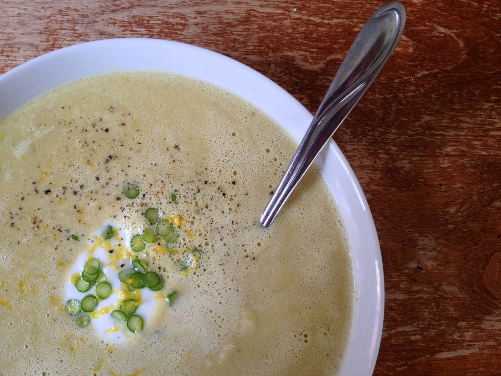 3. Réduire en purée lisse à l’aide d’un robot culinaire ou d’un bras mélangeur et filtrer le mélange dans un chinois, si désiré. Servir avec la fleur d’ail, un peu de yogourt et quelques copeaux de parmesan, au goût.