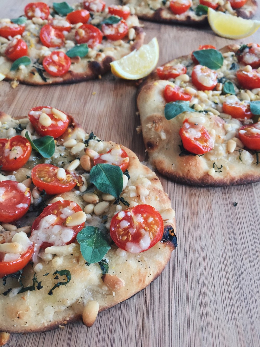 3. Dans un petit bol, mélanger l’ail et l’huile d’olive et badigeonner les pains naan. Ajouter le reste des ingrédients, saler et poivrer puis mettre au four pendant 8 à 12 minutes.