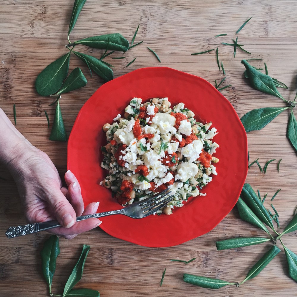 Salade de choux-fleurs & pois chiches au pesto de tomates séchées & poivrons rôtis