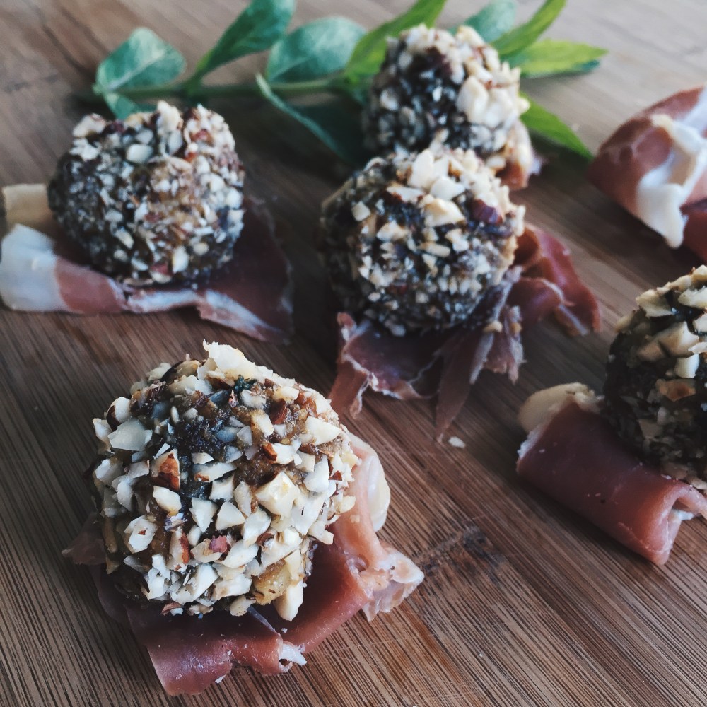 - Former des bouchées avec une cuillère à table (15 ml) et les rouler dans les noisettes hachées. Ajouter des morceaux de prosciutto et servir.